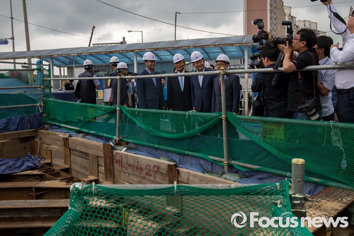 (서울=포커스뉴스) 김종인 더불어민주당 비상대책위 대표가 30일 오전 서울 용산구 한강로 빗물펌프장을 방문해 공사현장을 둘러 보고 있다.