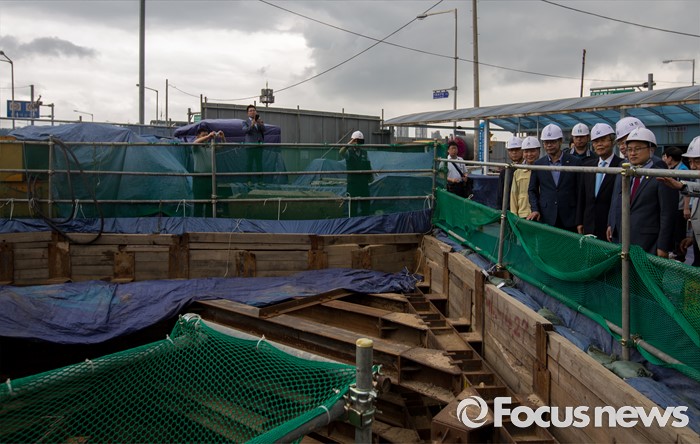 (서울=포커스뉴스) 김종인 더불어민주당 비상대책위 대표가 30일 오전 서울 용산구 한강로 빗물펌프장을 방문해 공사현장을 둘러 보고 있다.