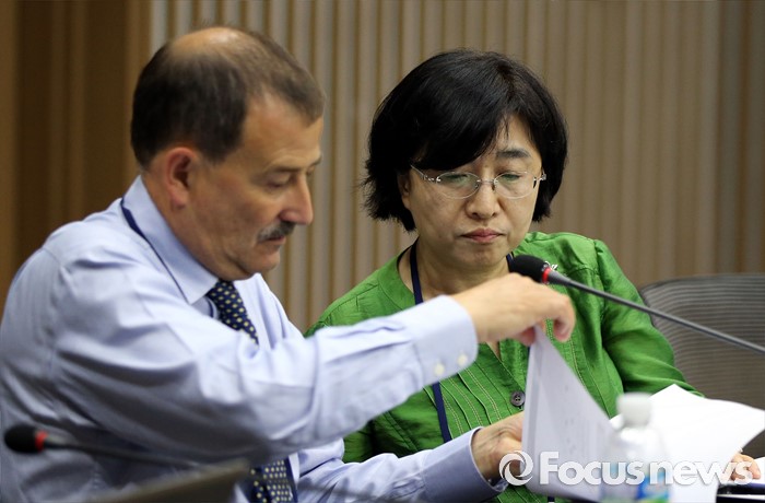 (청주=포커스뉴스) 30일 오전 충북 청주 오송 C&V 센터에서 열린 제3차 바이오의약품분야 WHO협력센터 네트워크 회의에서 손여원 식품의약품안전평가원장이 이안 피버 영국 국립생물의약품 표준화연구소 세균부 부장과 대화하고 있다.