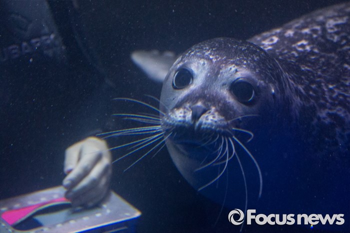 (서울=포커스뉴스) 30일 오전 서울 영등포구 여의도 한화 아쿠아플라넷63에서 열린 수족관 리뉴얼 오픈 기념행사에서 물범이 먹이를 기다리고 있다.