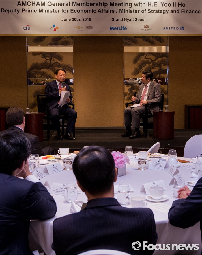 (서울=포커스뉴스) 유일호 경제부총리 겸 기획재정부 장관이 30일 오후 서울 용산구 그랜드하얏트 서울에서 열린 주한미국상공회의소 초청 오찬간담회에 참석해 사회자의 질문에 답하고 있다.