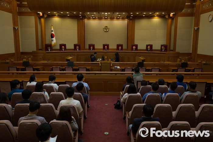 (서울=포커스뉴스) 30일 오후 서울 종로구 헌법재판소 대심판정에서 박한철 헌법재판소장이 '언론인 선거운동 금지' 공직선거법 제1항 제5호 위헌법률심판 사건 선고를 위해 착석해 있다.