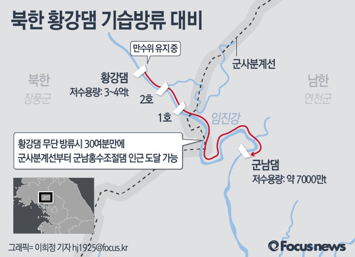 (서울=포커스뉴스) 27일 KBS는 아리랑위성 사진 판독결과 북한이 현재 황강댐을 만수위로 유지 중이라고 단독보도했다. 황강댐과 군남댐의 거리는 56㎞에 불과해 황강댐에서 기습적으로 초당 500t의 물을 내보낼 경우 우리가 방류를 인지할 수 있는 군사분계선으로부터 군남댐까지는 불과 30분 밖에 걸리지 않는다.