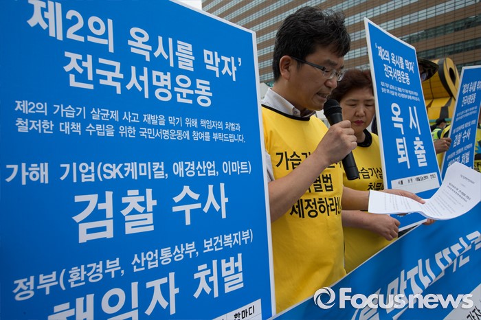 (서울=포커스뉴스) 30일 오후 서울 종로구 광화문광장에서 가습기살균제참사전국네트워크 회원들이 '제2의 옥시'를 막기 위한 서명운동 캠페인을 벌이고 있다.
