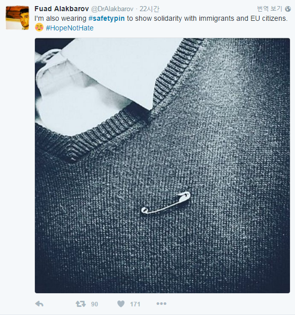 영국 국민들의 스스로 걱정할 정도로 영국에서는 이민자 혐오범죄가 늘어났다. 영국 일간지 인디펜던트 등 주요 외신은 28일 "영국무슬림위원회(MCB) 집계 결과 브렉시트 국민투표를 마친 지난 주말에만 100여건의 증오범죄가 발생했다"고 보도했다.영국의 유럽연합 탈퇴(브렉시트) 이후 증가한 이민자 혐오에 맞서기 위한 '옷핀 달기'가 유행하고 있다.<사진 캡쳐=트위터>영국의 유럽연합 탈퇴(브렉시트) 이후 증가한 이민자 혐오에 맞서기 위한 '옷핀 달기'가 유행하고 있다.<사진 캡쳐=트위터>영국의 유럽연합 탈퇴(브렉시트) 이후 증가한 이민자 혐오에 맞서기 위한 '옷핀 달기'가 유행하고 있다.<사진 캡쳐=트위터>