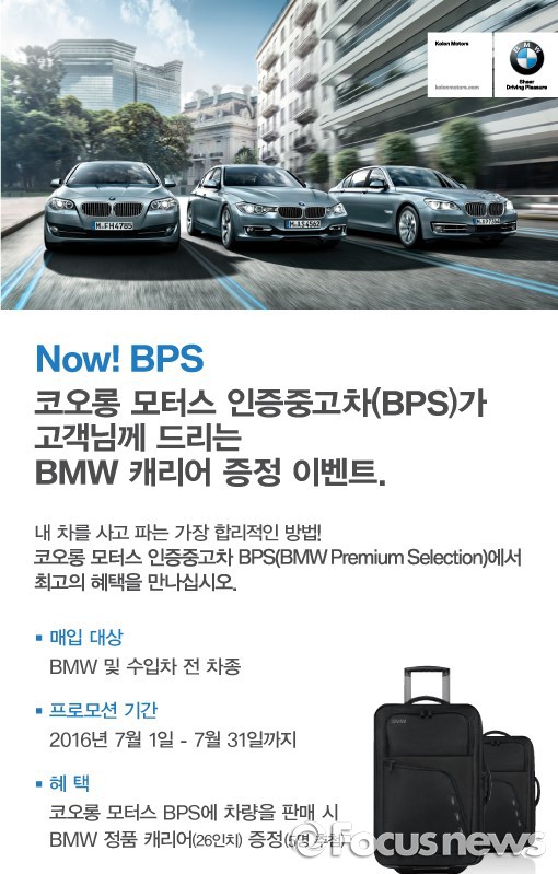(서울=포커스뉴스) BMW 프리미엄 인증중고차 BPS의 공식 딜러사인 코오롱 모터스가 본격적인 휴가철을 맞아 특별한 이벤트를 진행한다.