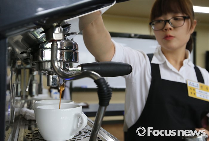 (청주=포커스뉴스) 30일 오후 충북 청주시 서원구 산남동 청주커피교육원에서 열린 충북 장애인기능경기대회 바리스타 종목 참가자가 과제를 수행하고 있다.