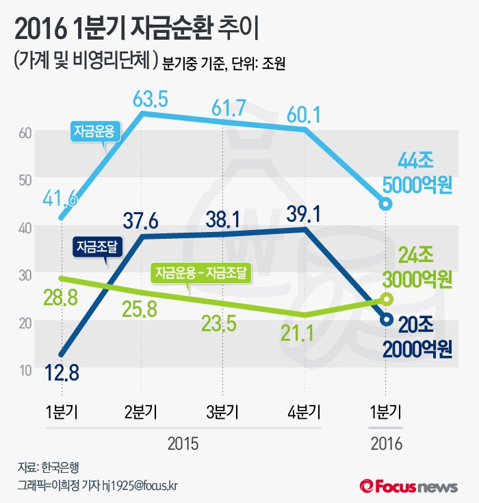 (서울=포커스뉴스) 한국은행이 30일 발표한 '2016년 1분기 중 자금순환(잠정)' 자료에 따르면 올 1분기 가계 및 비영리단체의 자금잉여 규모는 24조3000억원으로 전분기대비 늘어났다.