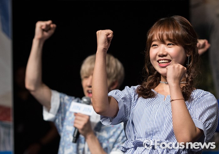 (서울=포커스뉴스) 30일 오후 서울 강남구 일지아트홀에서 열린 아이돌 그룹 아스트로의 두번째 미니앨범 'Summer Vibes' 발표 쇼케이스에 참여한 걸그룹 IOI의 멤버 최유정이 파이팅을 외치고 있다.