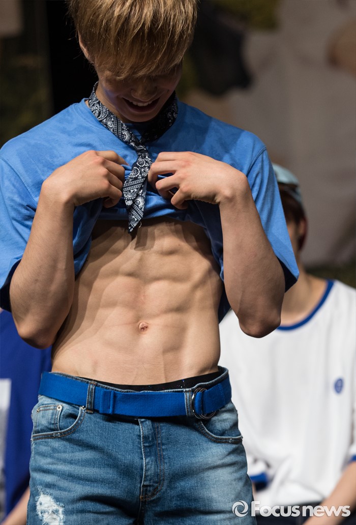 (서울=포커스뉴스) 30일 오후 서울 강남구 일지아트홀에서 열린 아이돌 그룹 아스트로의 두번째 미니앨범 'Summer Vibes' 발표 쇼케이스에 참여한 멤버 진진이 복근을 공개하고 있다.