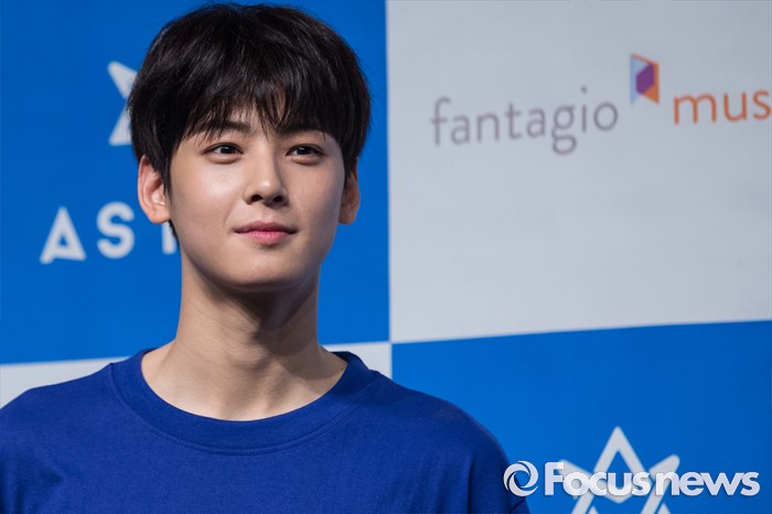 (서울=포커스뉴스) 30일 오후 서울 강남구 일지아트홀에서 열린 아이돌 그룹 아스트로의 두번째 미니앨범 'Summer Vibes' 발표 쇼케이스에 참여한 멤버 차은우가 포토타임을 갖고 있다.