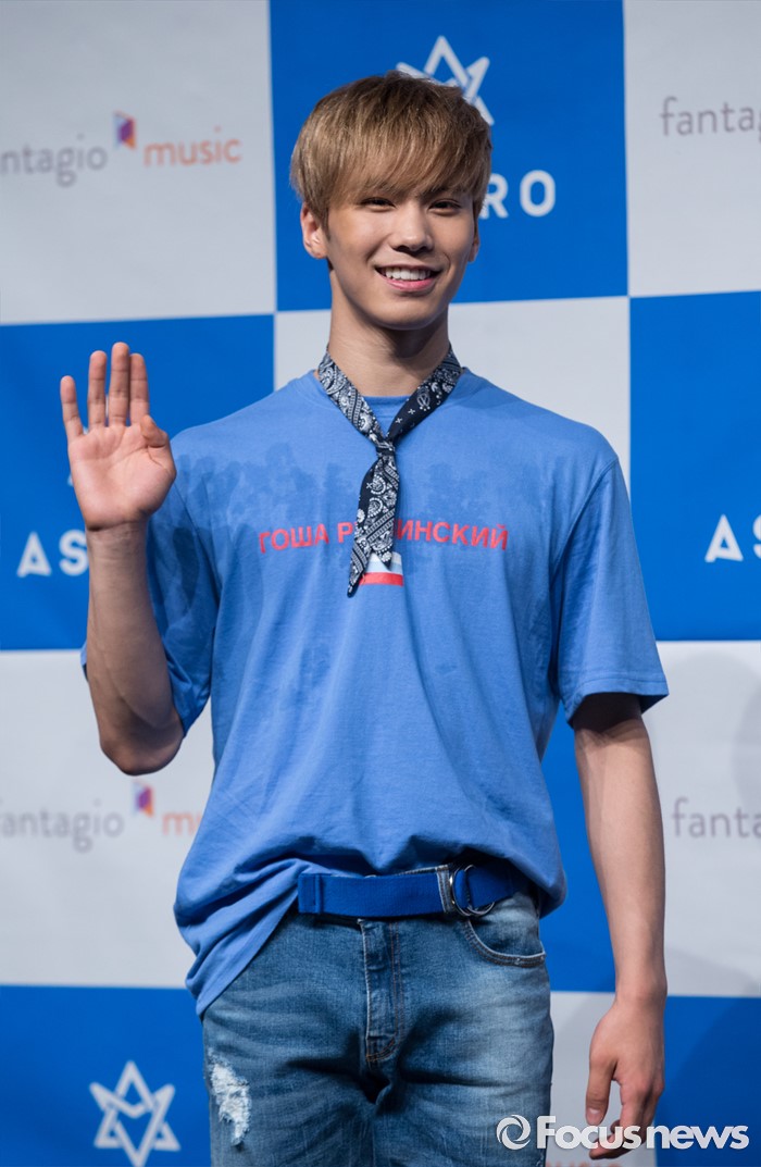 (서울=포커스뉴스) 30일 오후 서울 강남구 일지아트홀에서 열린 아이돌 그룹 아스트로의 두번째 미니앨범 'Summer Vibes' 발표 쇼케이스에 참여한 멤버 라키가 포토타임을 갖고 있다.