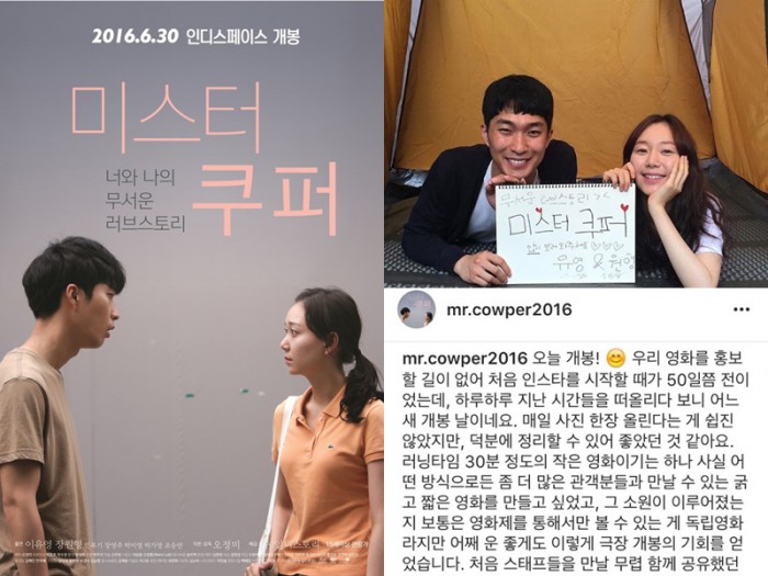 독립영화 '미스터 쿠퍼'는 서울 종로 서울극장 내부에 있는 인디스페이스에서 단독 개봉했다.영화 '미스터 쿠퍼' 메인포스터(왼쪽)와 소셜네트워크서비스(SNS)를 통해 오정미 감독이 공개한 촬영 이미지와 개봉 소감. <사진제공=인디스페이스>