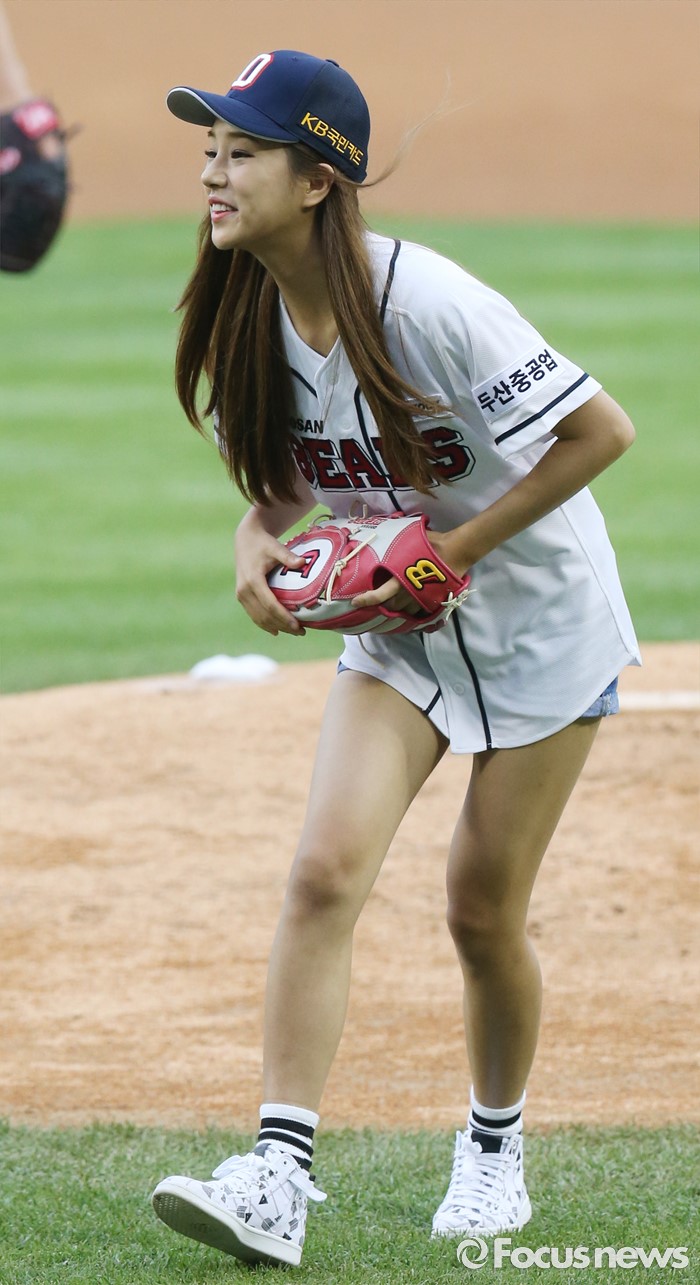 (서울=포커스뉴스) 30일 서울 잠실구장에서 열린 2016 프로야구 NC-두산 경기에 앞서 걸그룹 '라붐'의 솔빈이 시구를 마치고 팬들에게 인사하고 있다.