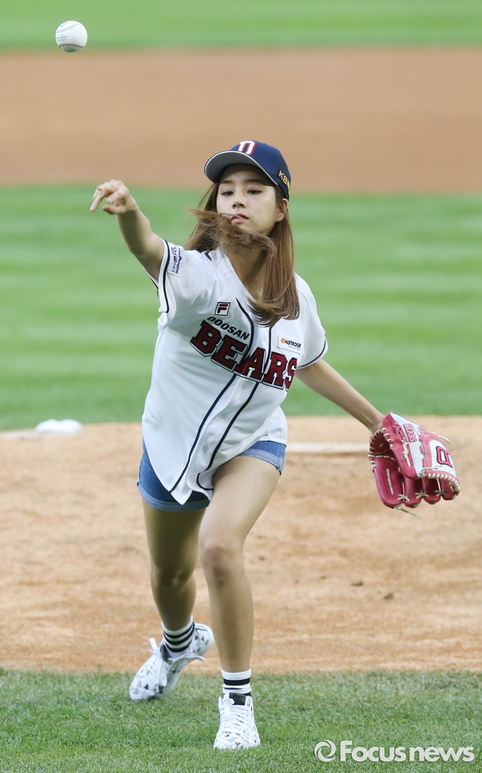 (서울=포커스뉴스) 30일 서울 잠실구장에서 열린 2016 프로야구 NC-두산 경기에 앞서 걸그룹 '라붐'의 솔빈이 시구하고 있다.