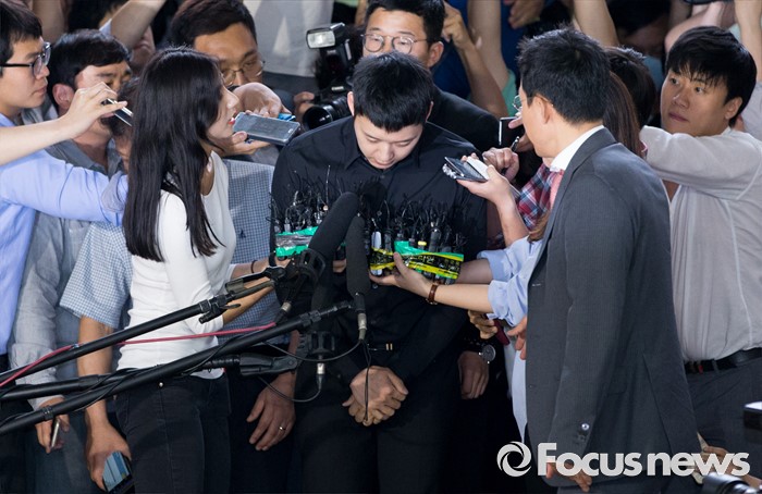(서울=포커스뉴스) 성폭행 혐의로 4명의 여성에게 연이어 피소된 가수 겸 배우 박유천이 30일 오후 서울 강남경찰서로 출석하고 있다.