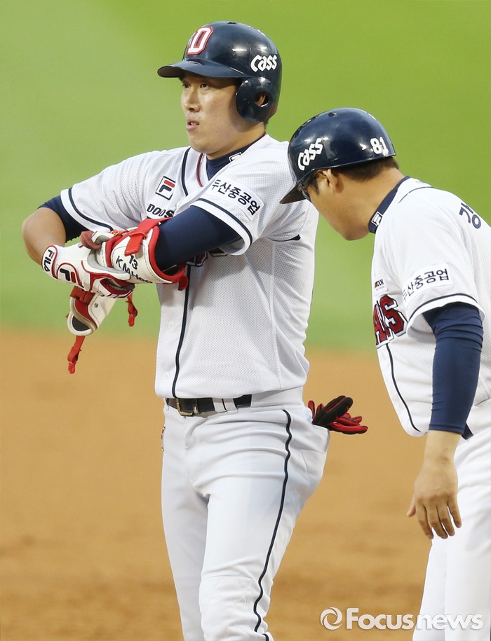 | △ 득점타 치고 여유있는 두산 허경민 |