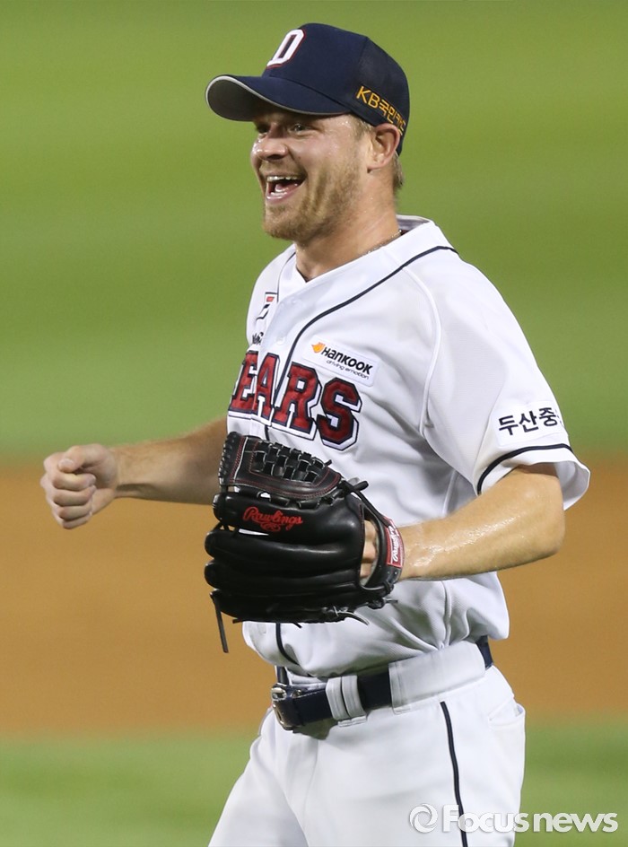 (서울=포커스뉴스) 30일 서울 잠실구장에서 열린 2016 프로야구 NC-두산 경기에서 두산 투수 보우덴이 9이닝 동안 139구를 던지며 KBO리그 역대 13번째 노히트노런을 달성하며 시즌 10승 고지에 올랐다. NC 마지막 타자 나성범을 삼진 아웃시키고 펄쩍 뛰며 환호하고 있다.