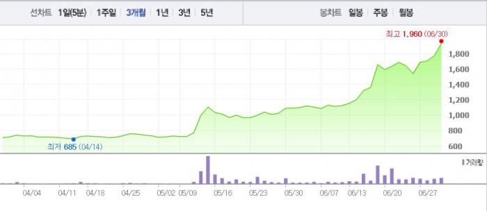 그 전에도 키스톤글로벌은 10일부터 17일까지 6거래일 연속 상승세를 나타내는 등 꾸준히 상승세를 나타냈다. 1달 전 주가인 6월1일(1100원)과 비교했을 때 무려 86.8% 상승한 수치다.