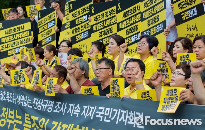 (서울=포커스뉴스) 1일 오전 서울 중구 나라키움저동빌딩 앞에서 열린 '세월호 특조위 성역없는 진상규명 조사 지속 지지 기자회견'에 참석한 416가족협의회와 4.16연대 회원들이 세월호 특별법 개정을 요구하는 구호를 외치고 있다.