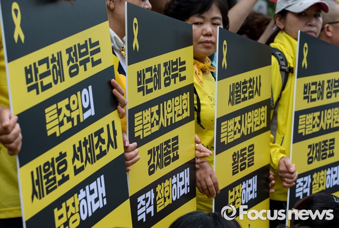 (서울=포커스뉴스) 1일 오전 서울 중구 나라키움저동빌딩 앞에서 열린 '세월호 특조위 성역없는 진상규명 조사 지속 지지 기자회견'에 참석한 416가족협의회와 4.16연대 회원들이 특조위 활동 보장을 요구하는 손팻말을 들고 있다.