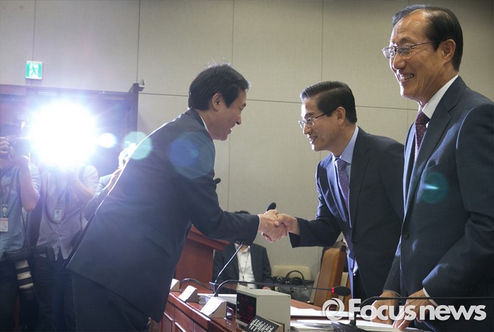 (서울=포커스뉴스) 1일 오전 서울 여의도 국회에서 열린 운영위원회 전체회의에 참석한 우상호(왼쪽) 더불어민주당 원내대표와 이영래(가운데) 대통령경호실 차장 직무대리가 인사하고 있다. 오른쪽은 이원종 대통령비서실장.