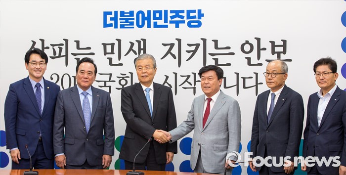 (서울=포커스뉴스) 김종인(왼쪽 세 번째) 더불어민주당 비상대책위 대표와 박성택(오른쪽 세 번째) 중소기업중앙회 회장이 1일 오전 서울 여의도 국회에서 면담에 앞서 악수 하고 있다.
