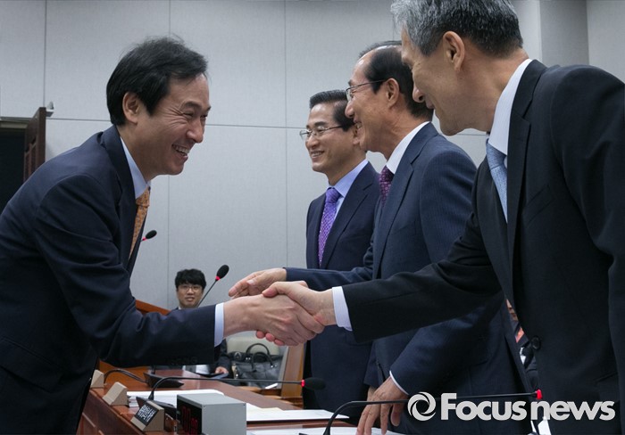 (서울=포커스뉴스) 1일 오전 서울 여의도 국회에서 열린 운영위원회 전체회의에 참석한 우상호(왼쪽부터) 더불어민주당 원내대표, 이영래 대통령경호실 차장 직무대리, 이원종 대통령비서실장, 김관진 국가안보실장이 인사하고 있다.