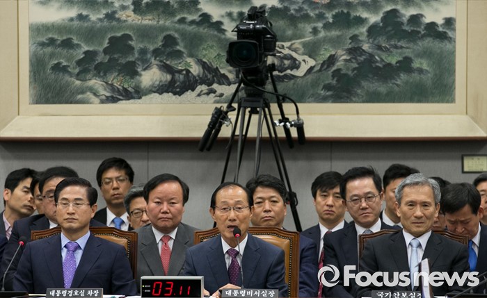 (서울=포커스뉴스) 1일 오전 서울 여의도 국회에서 열린 운영위원회 전체회의에 참석한 이원종(가운데) 대통령비서실장이 의원들의 질의에 답하고 있다.