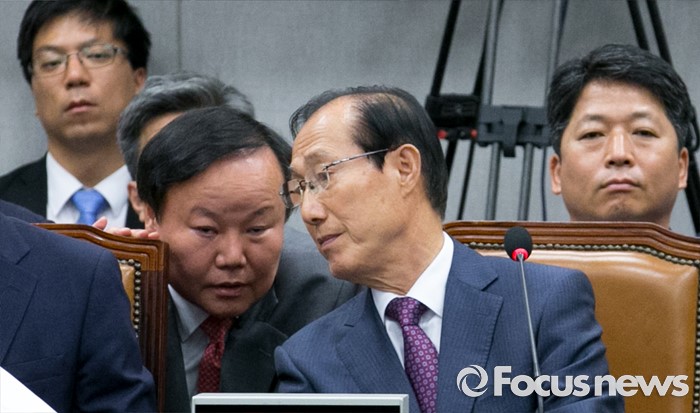 (서울=포커스뉴스) 1일 오전 서울 여의도 국회에서 열린 운영위원회 전체회의에 참석한 이원종(가운데) 대통령비서실장과 김재원(왼쪽) 청와대 정무수석이 대화하고 있다.