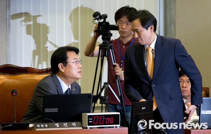 (서울=포커스뉴스) 1일 오전 서울 여의도 국회에서 열린 운영위원회 전체회의에 참석한 정진석(왼쪽) 위원장과 우상호 더불어민주당 원내대표가 대화하고 있다.