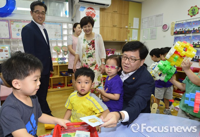 (서울=포커스뉴스) 어린이집을 종일반과 맞춤반으로 나눈 맞춤형 보육 제도가 시행된 1일 서울 성동구 신영창의어린이집을 방문한 정진엽 보건복지부 장관이 원아들과 대화하고 있다.