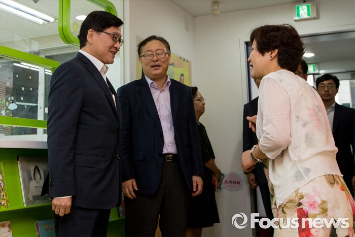 (서울=포커스뉴스) 어린이집을 종일반과 맞춤반으로 나눈 맞춤형 보육 제도가 시행된 1일 서울 성동구 신영창의어린이집을 방문한 정진엽 보건복지부 장관이 안미숙 원장과 대화하고 있다.