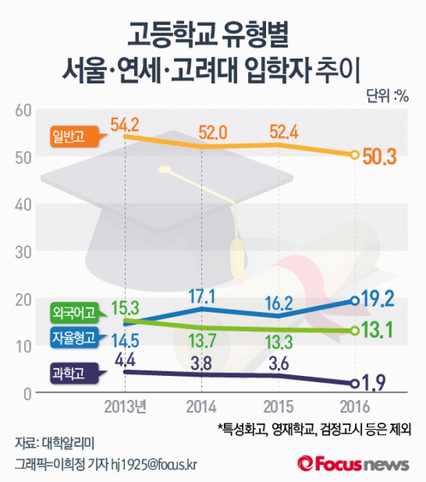 (서울=포커스뉴스) 서울대·연세대·고려대(본교 기준)의 일반고등학교 졸업자(재수생 이상 포함) 입학비율이 갈수록 낮아지는 추세다. 반면 자율형고등학교의 입학율은 점차 높아지고 있다.