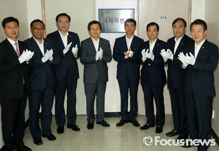 (서울=포커스뉴스) 황교안 국무총리를 비롯한 참석자들이 1일 오후 서울 종로구 정부서울청사에서 제1차 국가테러대책위원회를 마친 후 대테러센터 현판식을 하고 있다. 왼쪽부터 최윤수 국정원 제2차장, 홍윤식 행정자치부 장관, 김현웅 법무부 장관, 황교안 국무총리, 문영기 대테러센터장, 한민구 국방부 장관, 이석준 국무조정실장, 강신명 경찰청장.
