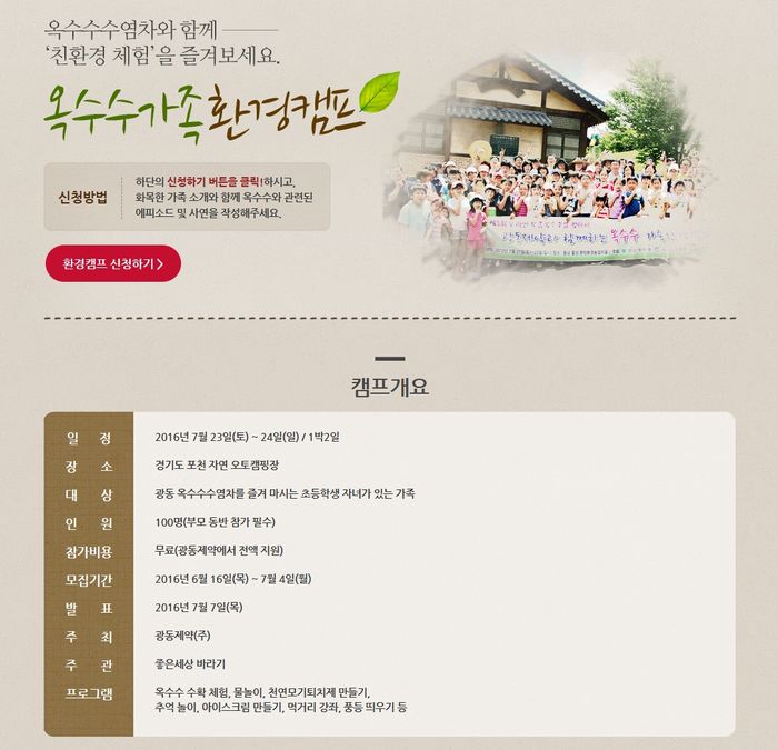 이달 경기도 포천에서 개최되는 제9회 옥수수가족환경캠프는 광동제약이 주최하고 좋은세상 바라기가 주관하는 친환경 가족체험 행사로, 지난 2008년부터 시작돼 올해 9회째 진행되고 있다.