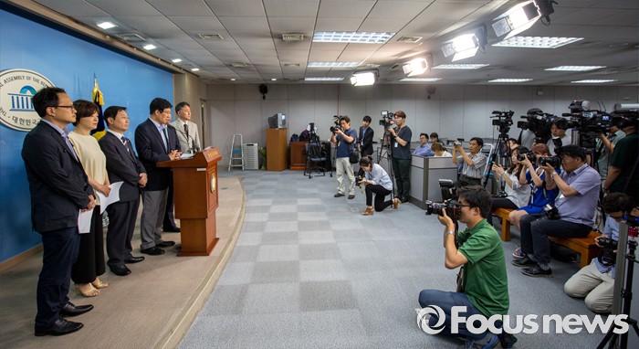 (서울=포커스뉴스) 1일 오후 서울 여의도 국회에서 더불어민주당 공정언론 특위 민주주의회복TF 소속 의원 및 국회 미래창조과학방송통신위원회 소속 의원들이 이정현 새누리당 의원의 청와대 홍보수석 재임시 KBS 보도 개입과 관련해 브리핑 하고 있다.