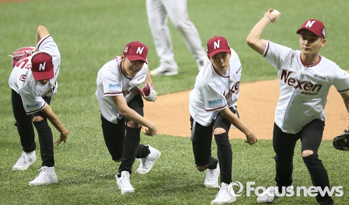(서울=포커스뉴스) 1일 서울 고척 스카이돔에서 열린 2016 프로야구 KIA-넥센 경기에서 남성 6인조 아이돌그룹 MAP6가 시구하고 있다.