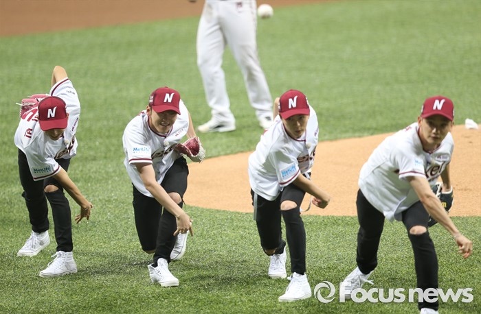 (서울=포커스뉴스) 1일 서울 고척 스카이돔에서 열린 2016 프로야구 KIA-넥센 경기에서 남성 6인조 아이돌그룹 MAP6가 시구하고 있다.