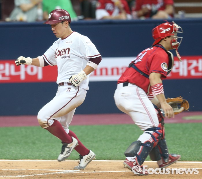 (서울=포커스뉴스) 1일 서울 고척 스카이돔에서 열린 2016 프로야구 KIA-넥센 경기 3회말 무사 만루에서 넥센 김하성의 좌전 안타때 2루주자 서건창이 홈인하고 있다.