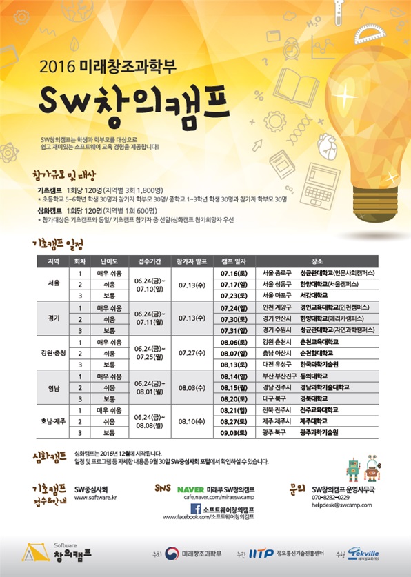 16일 서울을 시작으로 9월 초까지, 경기, 강원·충청, 영남, 호남·제주에서 권역별 3회 등 총 15회 개최된다. 12월부터 내년 1월초까지는 기초캠프 참가자 중에서 선발해 SW창작활동을 직접 체험하는 심화캠프를 개최할 예정이다. 심화캠프는 권역별 1회, 총 5회 개최된다.