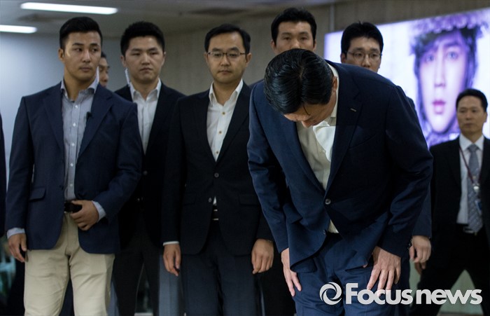 (서울=포커스뉴스) 신동빈 롯데그룹 회장이 3일 오후 서울김포공항을 통해 귀국, 취재진을 향해 허리 숙여 사과하고 있다. 신 회장은 이날 기자들에게 최근 롯데그룹을 둘러싼 일련의 사태에 대해 "죄송하다"고 공식 사과 했다.