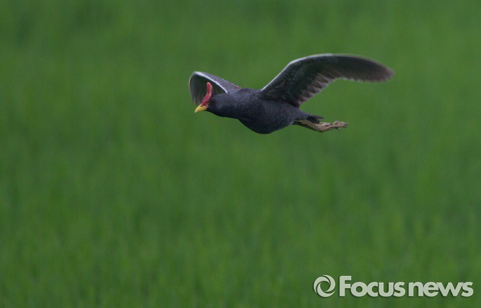 (파주=포커스뉴스)여름철새 뜸부기(천연기념물 446호) 수컷이 3일 경기도 파주시 임진강변 논에서배우자를 찾고 있다. 뜸부기는 한 때,전국의 논에서 흔하게 보였으나,과도한 농약과 비료의 사용, 무분별한 남획으로 지금은 멸종위기에 처해 있다. 그러나 유기영농을 하는 논에는 이처럼 드물게 찾아 온다.
