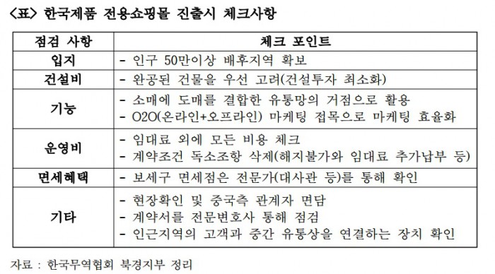 보고서는 "중국 내 쇼핑몰 입점을 고려한다면 무역전문 기관이나 중국 당국을 통해 관련 법규를 반드시 확인해야 하며, 쇼핑몰 건설에 자금을 투자하는 장기프로젝트에 참여하기보다는 쇼핑몰의 인테리어가 완료된 후에 입주해 위험을 최소화해야 한다"고 강조했다.중국 내 한국제품 전용쇼핑몰 진출시 고려사항 정리표 <자료제공=한국무역협회>