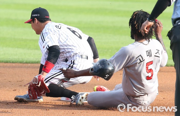 (서울=포커스뉴스) 3일 서울 잠실구장에서 열린 2016 프로야구 SK-LG 경기 1회초 초구를 때려 좌중간 안타로 진루한 SK 고메즈가 1사후 김강민 타석때 2루 도루를 시도해 세이프되고 있다.