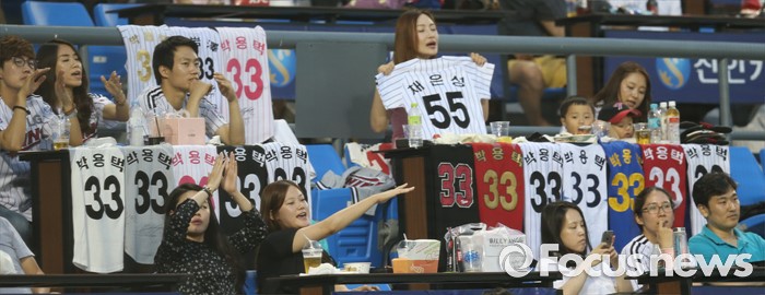 (서울=포커스뉴스) 3일 서울 잠실구장에서 열린 2016 프로야구 SK-LG 경기에서 LG 박용택의 팬들이 테이블석에 유니폼을 종류별로 걸어 놓고 응원하고 있다.