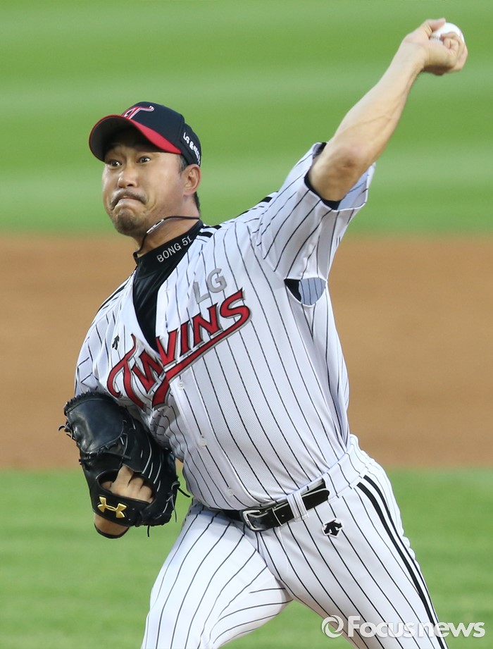 (서울=포커스뉴스) 3일 서울 잠실구장에서 열린 2016 프로야구 SK-LG 경기에서 LG 투수 봉중근이 5회초 선발 류제국을 구원 등판해 투구하고 있다.