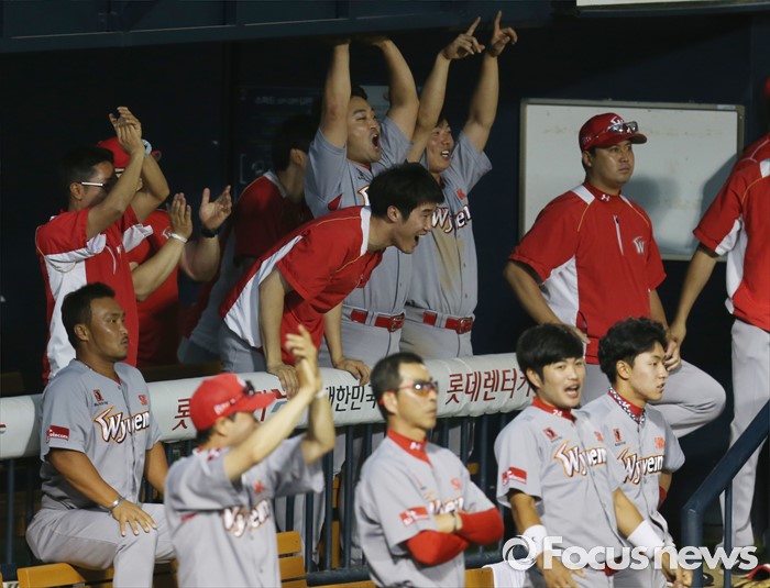 (서울=포커스뉴스) 3일 서울 잠실구장에서 열린 2016 프로야구 SK-LG 경기 8회말 1사 1,2루에서 SK 우익수 김재현이 LG 정성훈의 타구를 펜스에 부딪히며 잡아내자 덕아웃의 선수들이 환호하고 있다.