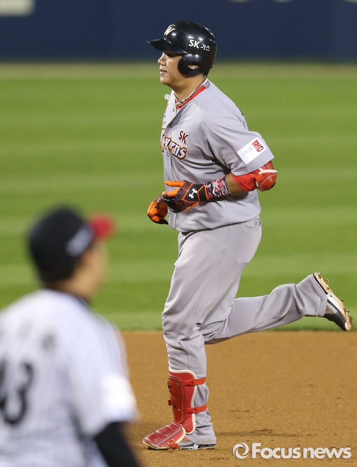 (서울=포커스뉴스) 3일 서울 잠실구장에서 열린 2016 프로야구 SK-LG 경기 8회초 1사 1루에서 SK 최승준이 우중월 2점 홈런을 치고 그라운드를 달리고 있다.