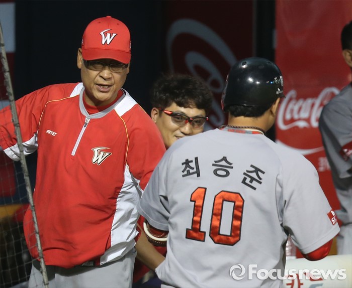 (서울=포커스뉴스) 3일 서울 잠실구장에서 열린 2016 프로야구 SK-LG 경기 8회초 1사 1루에서 SK 최승준이 우중월 2점 홈런을 치고 덕아웃에서 김용희 감독의 환영을 받고 있다.